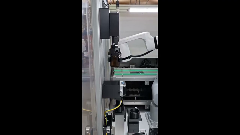De op maat gemaakte elektrische grijper wordt gebruikt om flacons en spuiten in een vulinstallatie te transporteren. Dankzij de geïntegreerde positiedetectie van de grijper worden de verschillende producten gedetecteerd en wordt verlies onmiddellijk herkend.
